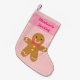Ein niedlicher Strumpf für das wenig eine, zum der wenigen Weihnachtsgeschenke anzufüllen. Entwurf kommt mit einem niedlichen Cartoon eines glücklichen Lebkuchen-Mannes mit gelben Gummitropfen als Knöpfe und des weißen Zuckergusses für Dekorationen. Ein netter und froher Entwurf während frohen Weihnachten und festlichen Jahreszeiten! Ein süßes Muster der rosa Herzen und der weißen Punkte für den Hintergrund. Personifizieren Sie mit dem Namen des Kindes.