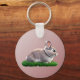 Ein niedlicher, grau-brauner Hasen, der auf einem grünen Grasstreifen sitzt, zusammen mit den Worten "Happy Oaster!". Der Schlüsselanhänger kann personalisiert sein: Sie können den Text ändern und Ihr eigenes Bild hochladen.