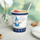 Erstellen Sie personalisierte Weihnachtsbecher in Blau und Weiß für Ihr Party mit einem einzigartigen Design, das ein fröhliches Sprichwort, niedliche Gnome und Text-Vorlagen für das Jahr und Familienname.