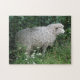 Dieses phantastische Rätsel zeigt ein Foto eines niedlichen flauschigen Schafes. Die Schafe sind von wilden Blume und langen Gras umgeben und essen gierig ein paar Blätter. Es hat einen dicken weißen Wollmantel und eine niedliche schwarze Nase.