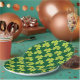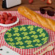 Teller mit niedlichem Wiederholmuster mit Olivgrün-Kleeblatten auf dunkelgrünem Hintergrund.