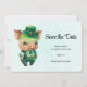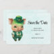 Save the Date Karte mit einer niedlichen grünen Abbildung eines auf den Hinterfüßen stehenden Schweins, gekleidet in extravagantem Hut, Weste und Hose. Sehr schön.