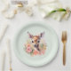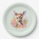 Papier Teller mit einer schönen Abbildung mit einem niedlichen Hirsch. Umgeben von rosa Rosen und Blume.