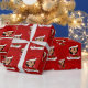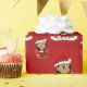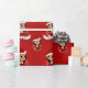 Papier mit einer Illustration eines niedlichen kleinen, glücklichen Lächelnden Latina/Hispanic oder asiatischen Mädchen mit langen schwarzen Haaren, der in Weihnachtskleider gekleidet ist und einen roten Weihnachtshut trägt und ein Geschenk hält; Weihnachtsfeiertage auf rotem Hintergrund
