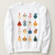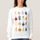 Eine Gruppe farbenfroher niedlicher und lustiger Hennen und Hähne, die in Linien stehend sind.