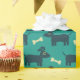 Umhüllungspapier mit einem sich wiederholenden Muster mit einem niedlich lächelnden Hündchen mit Diskettenohren und einem Hundeknochen. Grüner Hintergrund.