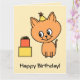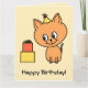 Ein süßes Cartoonbild einer orange Katze des kleinen Ingwers in einem Geburtstagshut, der nahe bei einigen Geburtstagsgeschenken sitzt.