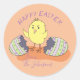Adorable Osteraufkleber mit einem kleinen gelben Küken, der gerade aus seinem Ei gebrochen hat. Personalisieren Sie es mit dem Namen Ihrer Familie . © ArianeC Illustrations-Alle Rechte vorbehalten