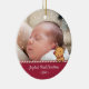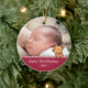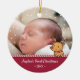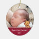 Ein niedliches personalisiertes Foto-Ornament zum Gedenken an die ersten Weihnachten Ihres Babys. Es ist mit einem Bonbonstreifen und einem kleinen Doodle-Banner für Rentiere ausgestattet, der den Namen Ihres Babys und das Weihnachtsjahr personalisiert. Schneeflocken umschließen das Ornament.