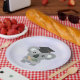 Papier Teller mit einer Illustration eines niedlichen grauen koala essen einige eukalyptus Blätter, mit einem schwarzen Graduierdeckel. Set auf einem leichten lila Aquarellhintergrund.