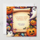 Das Design verfügt über einen Bildlauf in der Mitte über ein älteres Pergament, das einen Leerraum für Text bietet. Um die Schriftrolle herum befinden sich verschiedene Halloween-Symbole, darunter Lächeln von Jack-o’-Laternen, Geister mit verschiedenen Ausdrücken, Bonbons, Halloween-Lolli, schwarze Spinnen und Fledermäuse. Der Hintergrund ist sehr lila mit subtilen Sternmustern und schafft eine spielerische und sprichwörtliche Atmosphäre, die perfekt zu Halloween passt.