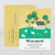 Niedliche Abbildung eines weißen Hauses auf dem Land mit viel Grün, Bäumen und grasbewachsenen Schafen. Anpassbare Typografie in Holzkohle, um neue Adressdetails zu aktualisieren. Auf der Rückseite der Postkarte finden Sie Ihre persönliche Nachricht für Familie und Freunde.