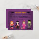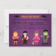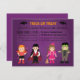 Haben Sie ein Halloween-Party? Laden Sie Ihre Gäste mit dieser lila Einladung ein. Es kommt mit Jungs und Mädchen in verschiedenen bezaubernden Monstern und Fantasy Outfits gekleidet, die kleine Teufel Outfit mit spitzen Schwanz, Hörner und Pitchfork beinhalten. Der Vampir mit Kap und Weste. Das kleine rosa Hexenkleid mit Broomstick und spitzer Hut. Das Monster von Frankenstein und großer komischer Anzug. Fledermäuse und Katzen schmücken die Einladung.