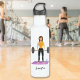 Diese Wasserflasche zeigt Desteis Darstellung eines niedlichen Mädchens, das einen Barbell auf dem Boden tötet. Das Mädchen hat braune, lange Haare und trägt ein orangefarbenes Shirt. Das Mädchen ist auf einer lila Matte stehend, auf der eine blaue Wasserflasche steht. Es gibt auch einen personalisierbaren Textbereich für einen Namen.