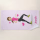 Dieses Handtuch zeigt Desteis Cartoon-Abbildung eines niedlichen Mädchens, das läuft und Lieben es. Das Mädchen hat lange braune Haare, die auf einem Pferdeschwanz stehen. Sie trägt ein rosa Shirt, schwarze Leggings und grüne Sportschuhe. Es gibt auch drei rosa Herzen um das Mädchen herum, die eine Liebe zum Laufen ausdrücken. Unter dem Bild befindet sich ein personalisierbarer Textbereich für einen Namen. Die Hintergrundfarbe ist hellrosa.