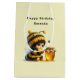 Geschenktasche mit einem niedlichen Bild. Ein Mädchen in einem Häkelkostüm mit Biene an ihrer Seite. Ein Glas Honig übergucken.