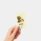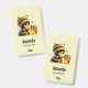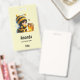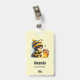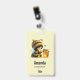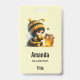 Name Tag mit einem niedlichen Bild. Ein Mädchen in einem Häkelkostüm mit Biene an ihrer Seite. Ein Glas Honig übergucken.