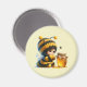 Magnet mit einem niedlichen Bild. Ein Mädchen in einem Häkelkostüm mit Biene an ihrer Seite. Ein Glas Honig übergucken.