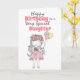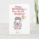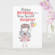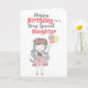 Eine schöne Abbildung eines Mädchens mit einem rosa Sommerkleid zeigt hübsche rosa Rosen im langen lockeren Haar und hält einen Haufen Blume und einen Haufen grauer, rosa und gelber Ballons. Die Wörter, der glückliche Geburtstag einer ganz besonderen Tochter (die in Enkelin, Nichte, Patenkind usw. umgewandelt werden kann) erscheinen auf einem hellblütigen rosa Hintergrund. Die Innenseite hat eine hübsche zarte Nachricht, die auf den Anzug angepasst werden sollte, egal welches Familienverhältnis Sie auf der Vorderseite eingefügt haben.