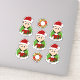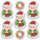 Set von sieben Vinyl-Aufklebern mit einer Illustration eines niedlichen kleinen, glücklichen lächelnden Mädchens mit kurzem schwarzem Haar, das in Weihnachtskleider gekleidet ist und einen roten Weihnachtshut auf grünem Hintergrund trägt; fünf Aufkleber des Mädchens und zwei Aufkleber mit einem Weihnachtskranz; mit einer anpassbaren Textvorlage für Ihren Namen oder Ihre Nachricht.