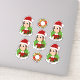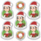 Set von sieben Vinyl-Aufklebern mit einer Illustration eines niedlichen kleinen, glücklichen lächelnden Mädchens mit langen braunen Haaren, das in Weihnachtskleider gekleidet ist und einen roten Weihnachtshut auf grünem Hintergrund trägt; fünf Aufkleber des Mädchens und zwei Aufkleber mit einem Weihnachtskranz; mit einer anpassbaren Textvorlage für Ihren Namen oder Ihre Nachricht.