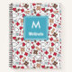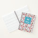 Niedliches Notizbuch der Krankenschwester mit einem medizinischen Muster der EKG-Kurve füllte Herz, Bandaien, Stethoskope, Thermometer und Medizin in rot vor weißem Hintergrund. Personalisieren Sie mit Namen und Initial gegen ein blaues Label.