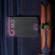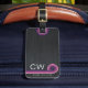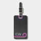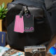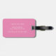 Modernes Retro-Gepäckanhänger mit rosa und lila Streifen auf schwarz gebürstetem Metall. Sans Serif Schriftart in Weiß. Die doppelseitige Option hat einen rosa Hintergrund mit weißer Schrift.