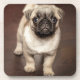 Foto eines entzückenden Mopswelpen stehend auf einem dunklen hölzernen Boden, der direkt der Kamera betrachtet.