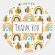 Vielen Dank an Aufkleber mit niedlichem gemustertem Hintergrund. Weiße Bienen und Regenbogen mit kleinen Herzen und Sternen verstreut herum. Schön und angenehm. Ein Rechteck überlagert mit Dankeschön, das Sie innen geschrieben haben.