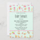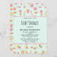 Einladungen zur Kinderdusche mit einem skurrilen Muster mit Kinderspielzeug und einer Sammlung von niedlichem Hirsch, Giraffe, Bären und mehr reizvollen Tieren.