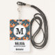 Benennen Sie Abzeichen mit einem Muster aus niedlichen und fröhlichen Orangenfüchse. Dunkelgrüner Hintergrund. Kleine Pilze und Blätter sprengen herum. Ein weißer Kreis lag oben mit dem Monogramm-Initial innen.