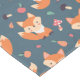 Eine Tischdecke mit niedlichen und fröhlichen orangefarbenen Füchsen. Dunkelgrüner Hintergrund. Kleine Pilze und Blätter sprengen herum.