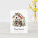 Niedliche Panda Santa Weihnachten Haus Grußkarte. Kawaii Stil Schwarz, Weiß und Rot Panda Bär mit Weihnachtsmannmütze und ein Geschenk vor Weihnachten Haus. Personalisierter Text.