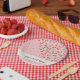Sommer und neuer Entwurf Hand gezeichnetes Watercolorkirschmuster und schwarzes Polkapunktmuster auf einem hellrosa Hintergrund kennzeichnend.