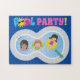 Im Sommer gibt es ein Party-Puzzle für phantastische Kinder. Verschiedene Mädchen in Innenschläuchen unter den lustigen Worten POOL PARTY.