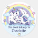 Adorable Buchzeichen Aufkleber mit einem niedlichen Cartoon gezeichnet Einhorn. Sie hat eine bunte Mane und Schwanz in pastellfarbener Blues, pinke und violette, ein gelbes Horn auf der Krone ihres Kopfes, einen weißen Körper und lila Hufe. Sie ist stehend auf lila Gras mit lila Sträuchern im Hintergrund und umgeben von bunten Sternen, einem wunderschönen Regenbogen und flauschigen Wolken. Unter der Abbildung befindet sich eine Vorlage, die Ihren Namen hinzufügen soll.