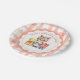 Adorable personalisiert Happy Birthday kitten Thema Papier Teller mit einem süßen Aquarell Kätzchen mit einem Kuchen umgeben von Geburtstagsgeschenken. Charmanter korallenfarbener karierter Hintergrund.