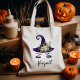 Diese Halloween-Tasche hat ein niedliches Hexengesicht mit einem lila Hut, der mit weißen Blume geschmückt ist. Passen Sie ihn mit ihrem Namen in einem Pinselpinsel mit schwarzer Handschrift an oder ändern Sie ihn in einen beliebigen Schriftart Ihrer Wahl. Perfekt für Trick oder Behandlung!
