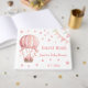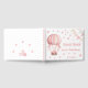 Schönes sonniges Fliegen in einem Ballon umgeben von Sternen. Illustration in Rosatönen auf weißem Hintergrund. Gästebuch für Babywünsche perfekt für eine Babydusche, wenn Sie ein Mädchen erwarten. Auf der Rückseite Abbildung von rosa Sternen und Geschenke.