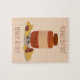 Puzzle mit einem illustrierten Entwurf eines lächelnden Erdnussbutterglases, das zwischen zwei Stapel der Erdnüsse stehend ist. Die Wörter "Erdnussbutter? Erdnuss besser!" stellen Sie über und unter dem Cartooncharakter dar. Alle Wörter können besonders angefertigt werden.