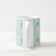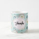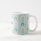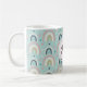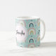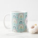 Eine Tasse mit einem hübschen Muster. Farbenfrohe Regenbögen in rosa, blau und grün. Kleine Herzen und Kreise fügen eine Touch von Launen hinzu. Niedliche Weiblichkeit und Spaß.