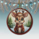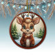 Dieser Rentierverzierung mit einem runden, braunen Holzrahmen verleiht ihm einen rustikalen und gemütlichen Look. Im Inneren des Ornaments entfaltet sich eine Weihnachtsszene mit einem niedlichen Hirsch mit Anbetern, in einem grafischen Stil des Cartoon, mit einem roten Pullover, Hut und Schal, im Vordergrund stehend. Der Hintergrund umfasst weiche, winterliche Elemente wie Weihnachtsbäume und ferne Winterschneelandschaft, die den Charme dieser wunderschönen, einzigartigen Illustrationsdekoration vervollständigen. Das gleiche Design ist vorne und hinten. So wird sichergestellt, dass der Schmuck, egal wie er sich dreht, immer festlich und vollständig aussieht🦌 🎄