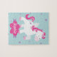 Personalisiertes Puzzlespiel, das ein niedliches magisches Unicornfliegen im Himmel mit lila Sternen kennzeichnet. Niedlicher und Spaßentwurf für Special für ein Mädchen das Lieben Unicorns und magische Ponys. Kundenspezifisches mit Monogramm Geschenk.