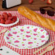 Papierplatte mit einem niedlichen Muster aus rosa und grüne, krustende Herzen auf weißem Hintergrund.