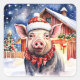 Niedliche Weihnachtsschwein-Aufkleber mit Aquarellhaken, die an einem schneebedeckten Wintertag vor einer Scheune stehend sind.
