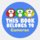 Niedliche Eulenbuchwurmkleber für Lehrer, die ihre Bücher für den Klassenraum oder für ein Kind in die Titelseite ihrer Lieblingsromane legen. Passen Sie Ihren Namen in hellgelb auf einem cool blauen Hintergrund unter DIESEM BUCH in Weiß an. Die Einrichtung ist mit einer roten, grünen und gelben Eule geschmückt.