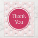 Ein Dankeschön Weinflaschenlabel. Danke, dass du in einen rosa roten Kreis geschrieben hast. Entworfen mit einem niedlichen Muster schlafender Kätzchen, die überall friedlich und glücklich aussehen. Rosa Hintergrund.