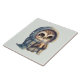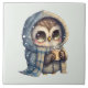 Entworfen mit einer kawaii Illustration einer großen mit Augen Eule in einem Winterrobe und Schal mit einem heißen Kaffee.