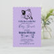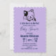 Eine Babydusche-Einladung, entworfen mit einer Illustration einer lächelnden und schwingenden Kätzin mit einem schwarzen Fleck um sein Ohr. Einfach niedlich und hübsch. Lila Polka Punkt Hintergrund auf der Rückseite.