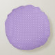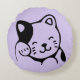 Ein rundes Kissen, entworfen mit einer Illustration einer lächelnden und schwungvollen Kätzin mit einem schwarzen Fleck um sein Ohr. Lila Hintergrund und ein Polka Punktmuster auf der Rückseite. Einfach niedlich und hübsch.